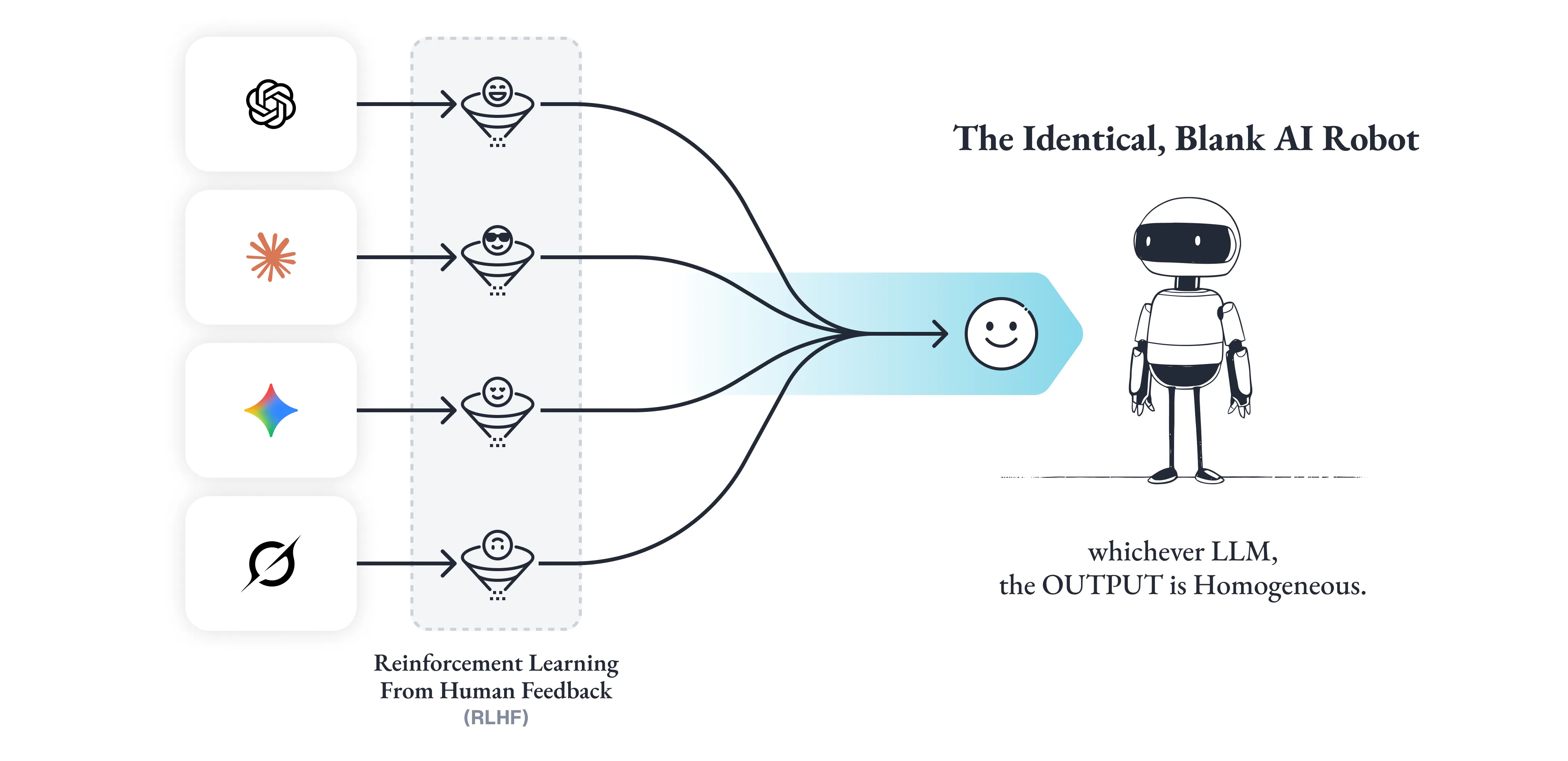 OpenAI、Google、Anthropicといった主要プレイヤーが提供する汎用LLMは、いずれも「安全で役立つアシスタント」として最適化されています。その結果、FAQ対応、検索補助、一次案内といった一般用途においては、一定水準以上の実用性が急速に標準化しつつあります。