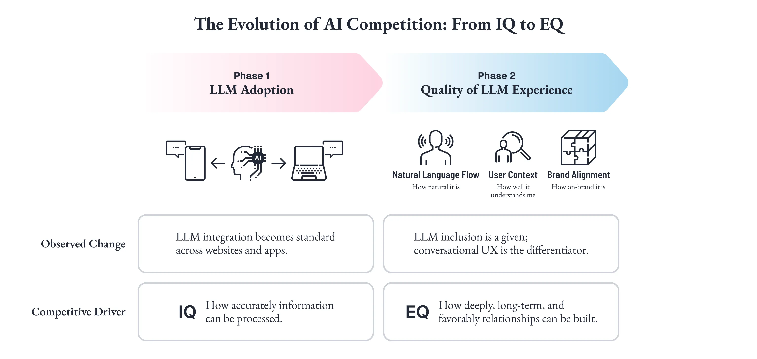 AI競争の第1フェーズが、どれだけ正確に情報を処理できるかという「IQ」の競争だったとすれば、第2フェーズは、どれだけ文脈を引き継ぎ、相手の温度感を読み、ブランドらしい一貫した振る舞いで長期的な関係を築けるかという「EQ」の競争です。