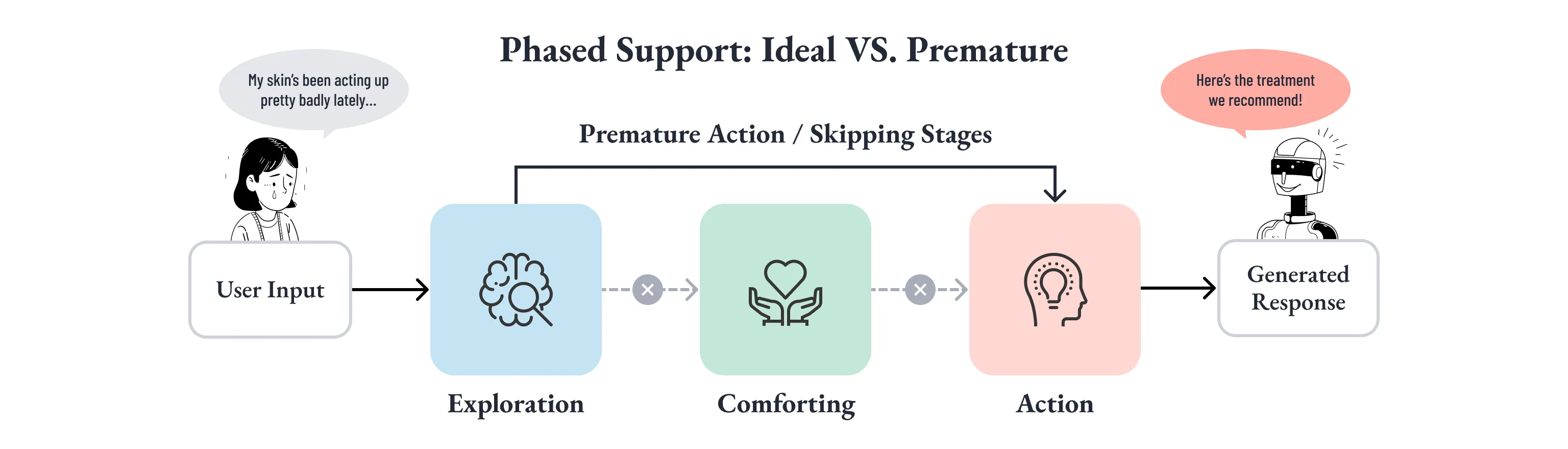 実際、汎用LLMは特定の支援戦略に偏りやすく、この偏りが高いほど低品質な応答が増えることが報告されています [11]。別の研究では、支援戦略を先に整える planner を挿入することで、低品質な応答が有意に減少しました [11]。つまり、応答の質を左右しているのは、助言の巧拙だけではなく、「どの段階で何を出すべきか」を外しやすいことなのです。